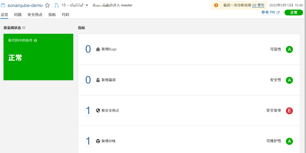 以上配置好后,提交 Merge Request 会发现自动触发扫描,并给出扫描结果。