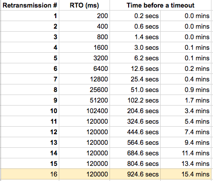 注意 RTO 时间是指数上升的,具体与操作系统内核实现有关,上图是一般情况的结果,可以发现重试 15 次后,第 16 次不成功的大概时间是 15 分钟,与问题反馈的情况一致。